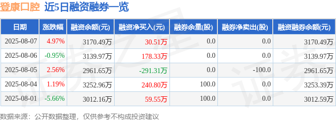 登康口腔融资融券信息显示,融资方面,当日融资买入872.2万元,融资偿还841.69万元,融资净买入30.51万元。融券方面,融券卖出0.0股,融券偿还0.0股,融券余量0.0股,融券余额0.0万元。融资融券余额3170.49万元。