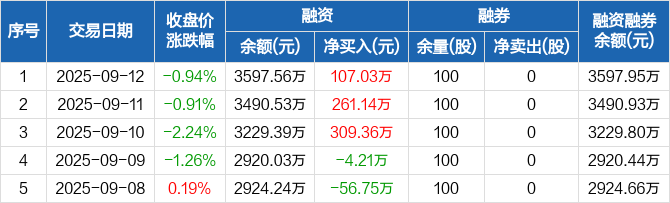 融资方面,当日融资买入486.36万元,融资偿还379.34万元,融资净买入107.03万元,连续3日净买入累计677.53万元。融券方面,融券卖出0股,融券偿还0股,融券余量100股,融券余额3987元。融资融券余额合计3597.95万元。
